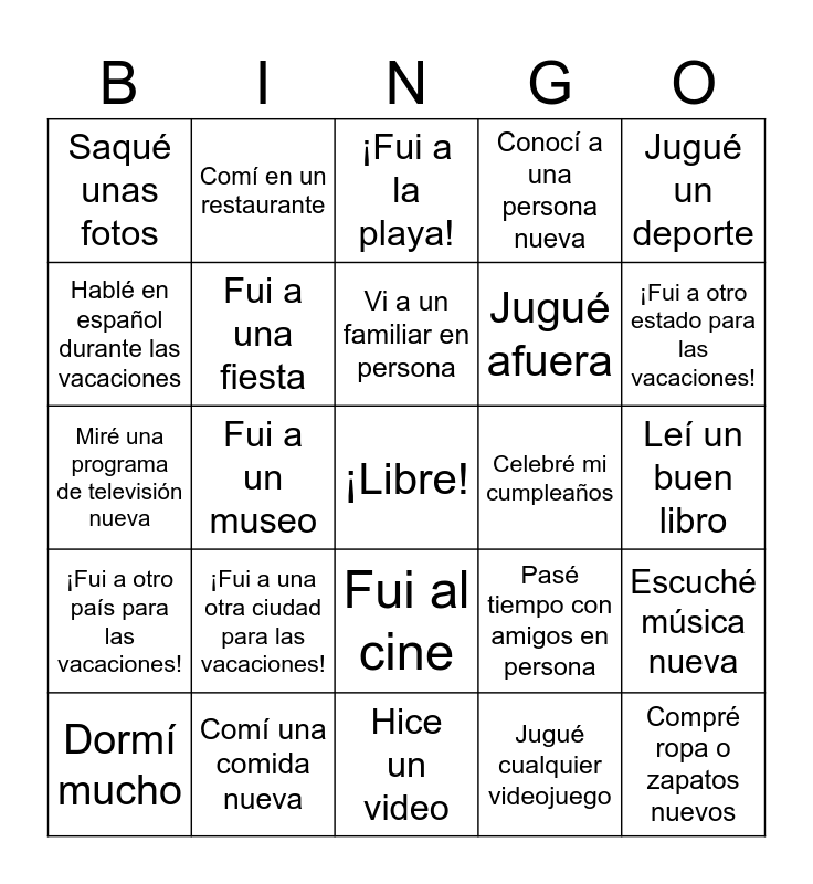 This bingo card has a free space and 24 words: ¡Fui a una otra ciudad para las vacaciones!, Comí una comida nueva, Vi a un familiar en persona, Dormí mucho, Jugué un deporte, Saqué unas fotos, Hablé en español durante las vacaciones, Comí en un restaurante, Celebré mi cumpleaños, Fui al cine, Jugué afuera, Miré una programa de televisión nueva, Pasé tiempo con amigos en persona, Escuché música nueva, Fui a una fiesta, Jugué cualquier videojuego, Leí un buen libro, ¡Fui a la playa!, ¡Fui a otro estado para las vacaciones!, Fui a un museo, Compré ropa o zapatos nuevos, ¡Fui a otro país para las vacaciones!, Conocí a una persona nueva and Hice un video.