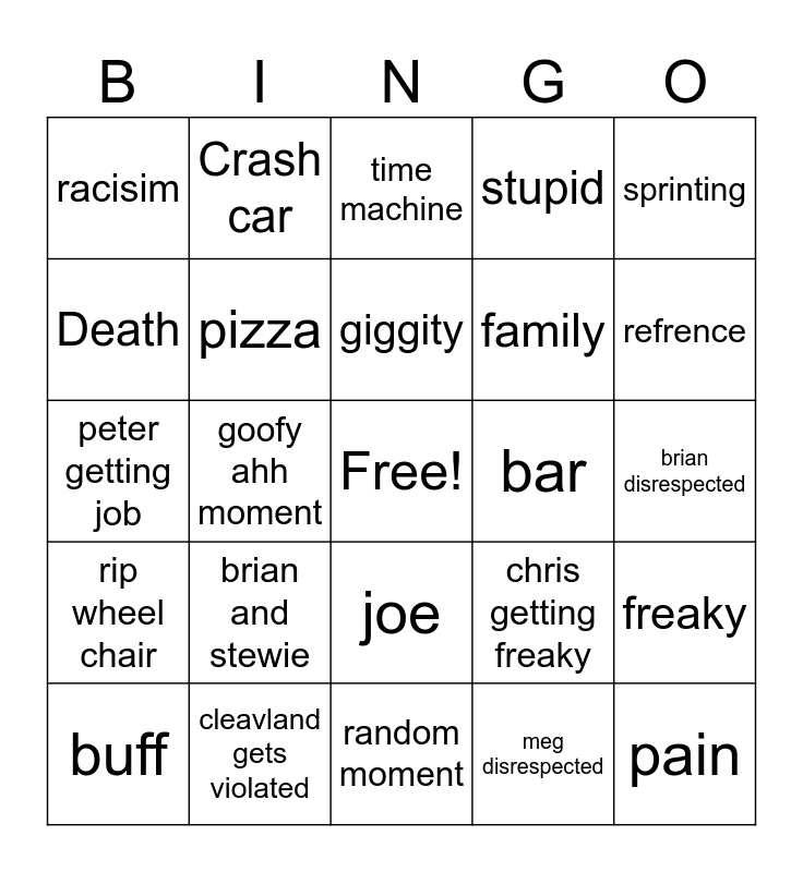 This bingo card has a free space and 24 words: brian and stewie, cleavland gets violated, giggity, buff, sprinting, racisim, Death, Crash car, bar, joe, family, peter getting job, chris getting freaky, freaky, pizza, meg disrespected, brian disrespected, time machine, refrence, goofy ahh moment, pain, rip wheel chair, stupid and random moment.