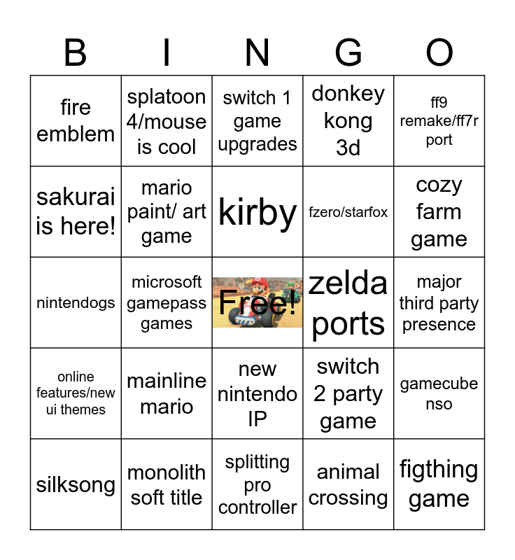This bingo card has a free space and 24 words: mainline mario, monolith soft title, kirby, silksong, ff9 remake/ff7r port, fire emblem, sakurai is here!, splatoon 4/mouse is cool, zelda ports, new nintendo IP, fzero/starfox, nintendogs, switch 2 party game, gamecube nso, mario paint/ art game, animal crossing, major third party presence, switch 1 game upgrades, cozy farm game, microsoft gamepass games, figthing game, online features/new ui themes, donkey kong 3d and splitting pro controller.
