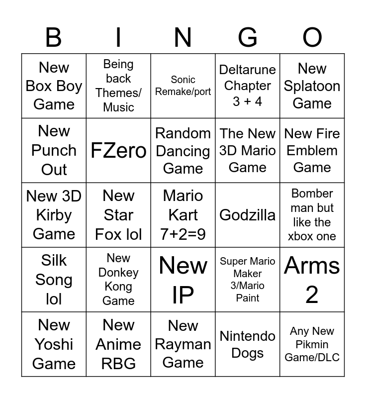 This bingo card has a free space and 24 words: New Donkey Kong Game, New Anime RBG, Random Dancing Game, New Yoshi Game, New Splatoon Game, New Box Boy Game, New Punch Out, Being back Themes/ Music, Godzilla, New IP, The New 3D Mario Game, New 3D Kirby Game, Super Mario Maker 3/Mario Paint, Arms 2, FZero, Nintendo Dogs, Bomber man but like the xbox one, Sonic Remake/port, New Fire Emblem Game, New Star Fox lol, Any New Pikmin Game/DLC, Silk Song lol, Deltarune Chapter 3 + 4 and New Rayman Game.