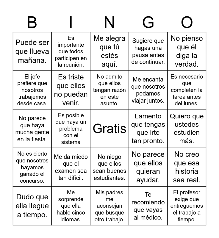 This bingo card has a free space and 29 words: Dudo que ella llegue a tiempo., No creo que ellos tengan razón, Es posible que haya un problema con el sistema, No estoy seguro de que él sepa la respuesta, Puede ser que llueva mañana., Me alegra que tú estés aquí., Es triste que ellos no puedan venir., Me da miedo que el examen sea tan difícil., Lamento que tengas que irte tan pronto., Me sorprende que ella hable cinco idiomas., Quiero que ustedes estudien más., El profesor exige que entreguemos el trabajo a tiempo., Mis padres me aconsejan que busque otro trabajo., Te recomiendo que vayas al médico., Es necesario que completen la tarea antes del lunes., No es verdad que ella tenga un coche nuevo., No niego que ellos sean buenos estudiantes., No es cierto que nosotros hayamos ganado el concurso., No pienso que él diga la verdad., No parece que haya mucha gente en la fiesta., No parece que ellos quieran ayudar., No estoy seguro de que el proyecto esté terminado., Me encanta que nosotros podamos viajar juntos., El jefe prefiere que nosotros trabajemos desde casa., Sugiero que hagas una pausa antes de continuar., Es importante que todos participen en la reunión., No creo que esa historia sea real., No admito que ellos tengan razón en este asunto. and Es una lástima que no tengas más tiempo libre..