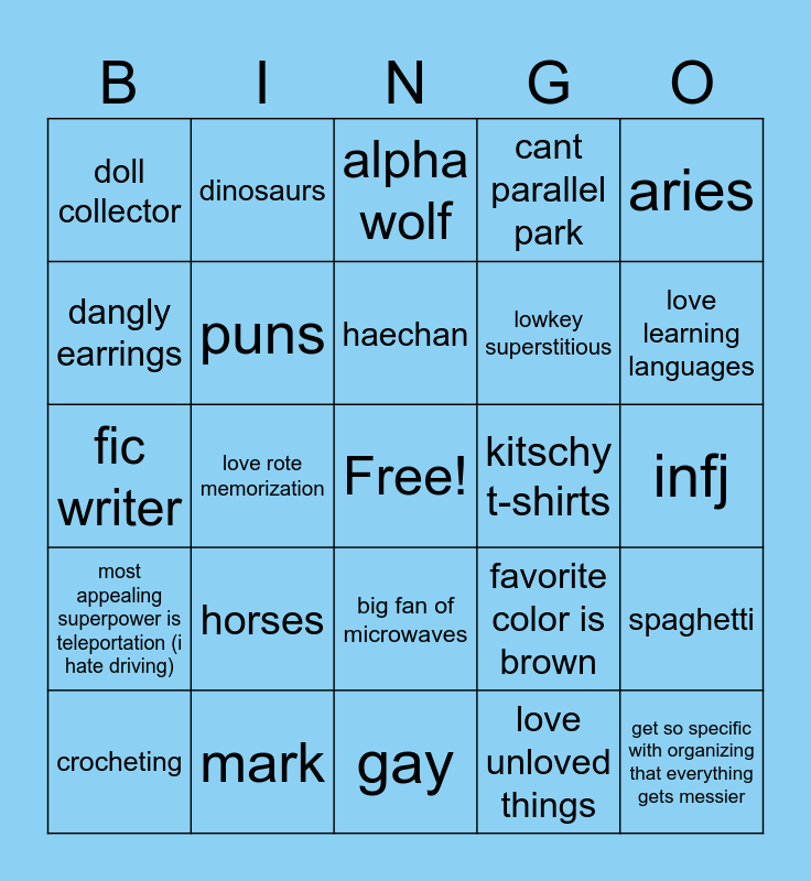 This bingo card has a free space and 24 words: horses, mark, haechan, crocheting, aries, doll collector, dangly earrings, dinosaurs, kitschy t-shirts, big fan of microwaves, lowkey superstitious, fic writer, favorite color is brown, spaghetti, puns, love unloved things, infj, alpha wolf, love learning languages, love rote memorization, get so specific with organizing that everything gets messier, most appealing superpower is teleportation (i hate driving), cant parallel park and gay.