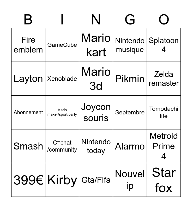 This bingo card has a free space and 24 words: 399€, C=chat /community, Mario 3d, Nouvel ip, Splatoon 4, Fire emblem, GameCube, Mario kart, Septembre, Tomodachi life, Abonnement, Xenoblade, Alarmo, Metroid Prime 4, Layton, Kirby, Gta/Fifa, Nintendo musique, Zelda remaster, Smash, Mario maker/sport/party, Nintendo today, Pikmin and Star fox.