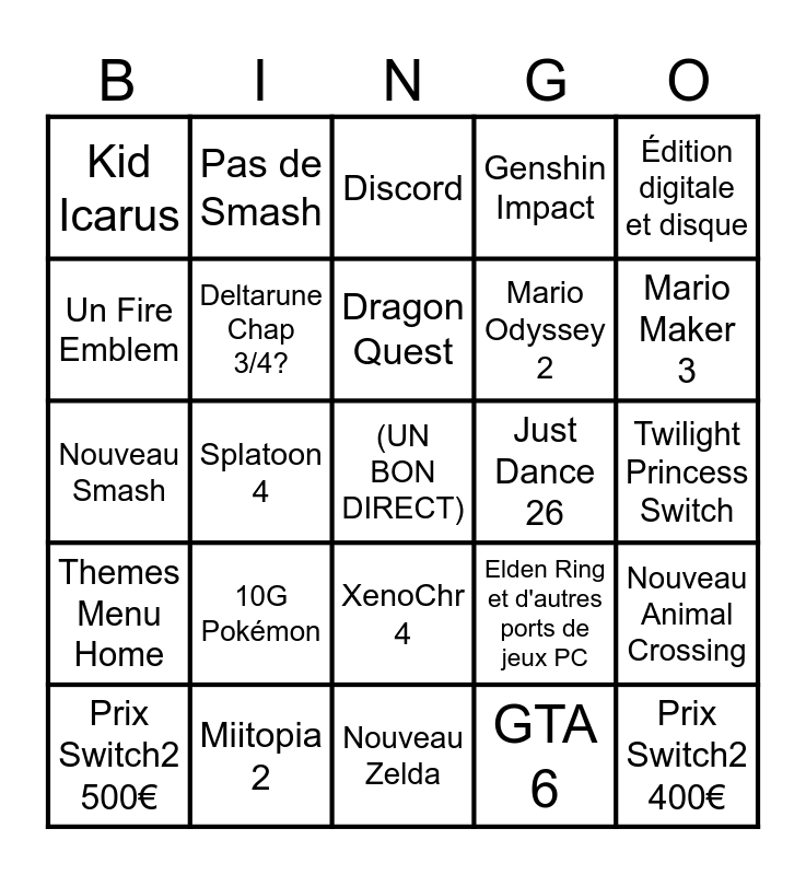 This bingo card has a free space and 24 words: 10G Pokémon, Miitopia 2, Dragon Quest, Prix Switch2 500€, Édition digitale et disque, Kid Icarus, Un Fire Emblem, Pas de Smash, Just Dance 26, XenoChr 4, Mario Odyssey 2, Nouveau Smash, Elden Ring et d'autres ports de jeux PC, Nouveau Animal Crossing, Deltarune Chap 3/4?, GTA 6, Twilight Princess Switch, Discord, Mario Maker 3, Splatoon 4, Prix Switch2 400€, Themes Menu Home, Genshin Impact and Nouveau Zelda.