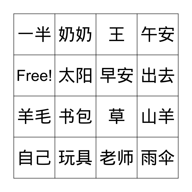 This bingo card has 16 words: 玩具, 山羊, 王, 一半, 羊毛, 奶奶, 草, 老师, Free!, 太阳, 自己, 午安, 书包, 出去, 早安 and 雨伞.