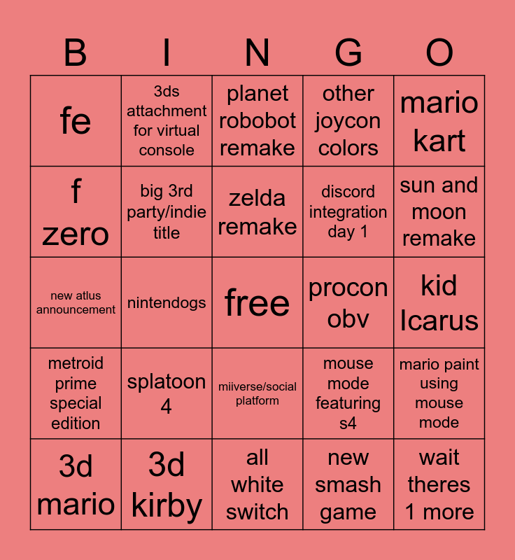 This bingo card has a free space and 24 words: splatoon 4, 3d kirby, zelda remake, 3d mario, mario kart, fe, f zero, 3ds attachment for virtual console, procon obv, miiverse/social platform, discord integration day 1, new atlus announcement, mouse mode featuring s4, mario paint using mouse mode, big 3rd party/indie title, new smash game, kid Icarus, planet robobot remake, sun and moon remake, nintendogs, wait theres 1 more, metroid prime special edition, other joycon colors and all white switch.
