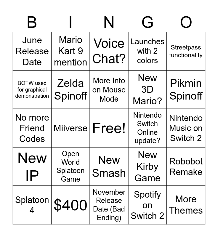 This bingo card has a free space and 24 words: Open World Splatoon Game, $400, More Info on Mouse Mode, Splatoon 4, Streetpass functionality, June Release Date, BOTW used for graphical demonstration, Mario Kart 9 mention, Nintendo Switch Online update?, New Smash, New 3D Mario?, No more Friend Codes, New Kirby Game, Robobot Remake, Zelda Spinoff, Spotify on Switch 2, Nintendo Music on Switch 2, Voice Chat?, Pikmin Spinoff, Miiverse, More Themes, New IP, Launches with 2 colors and November Release Date (Bad Ending).