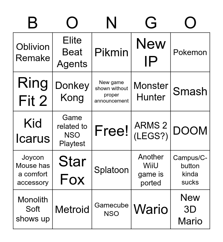 This bingo card has a free space and 44 words: Silksong, New 3D Mario, Mario Kart is actually Nintendo Kart, Monolith Soft shows up, New Zelda has nothing to show, Wario, Pikmin, F-Zero, Pokemon, Metroid, New IP, ARMS 2 (LEGS?), Splatoon, Star Fox, NSO seems like a worse deal, Gamecube NSO, Kirby, Kid Icarus, Sakurais new project?, Smash, Elite Beat Agents, Civilization, Elden Ring, Oblivion Remake, Starfield, DOOM, Switch 2 supports 4K, Rayman 4, Another WiiU game is ported, Joycon Mouse has a comfort accessory, Bill Trinen, Campus/C-button kinda sucks, Game looks like dogshit, New controller type, Game related to NSO Playtest, Golf, Game bundled with Console, Nintendo Movie announcement, New game shown without proper announcement, Ring Fit 2, Monster Hunter, 2015-tier Nintendo bit, Donkey Kong and Unexpected crossover.