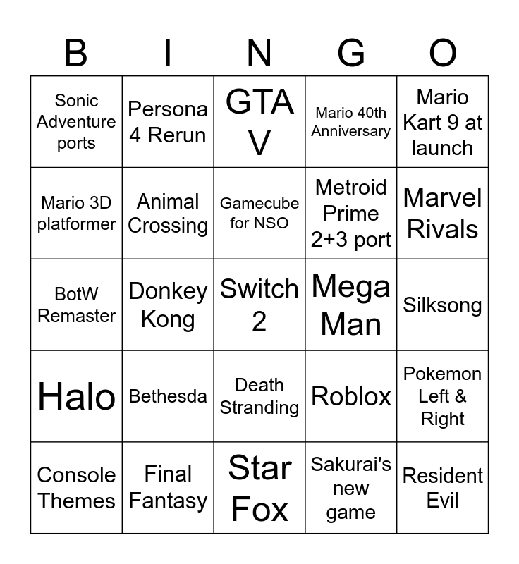 This bingo card has a free space and 24 words: Bethesda, Final Fantasy, Gamecube for NSO, Console Themes, Mario Kart 9 at launch, Sonic Adventure ports, Mario 3D platformer, Persona 4 Rerun, Mega Man, Death Stranding, Metroid Prime 2+3 port, BotW Remaster, Roblox, Pokemon Left & Right, Animal Crossing, Sakurai's new game, Silksong, GTA V, Marvel Rivals, Donkey Kong, Resident Evil, Halo, Mario 40th Anniversary and Star Fox.