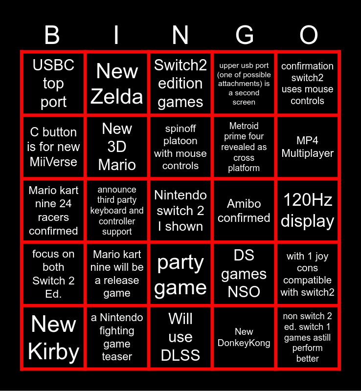 This bingo card has a free space and 24 words: Mario kart nine will be a release game, a Nintendo fighting game teaser, spinoff platoon with mouse controls, New Kirby, confirmation switch2 uses mouse controls, USBC top port, C button is for new MiiVerse, New Zelda, Amibo confirmed, party game, Metroid prime four revealed as cross platform, Mario kart nine 24 racers confirmed, DS games NSO, with 1 joy cons compatible with switch2, New 3D Mario, New DonkeyKong, 120Hz display, Switch2 edition games, MP4 Multiplayer, announce third party keyboard and controller support, non switch 2 ed. switch 1 games astill perform better, focus on both Switch 2 Ed., upper usb port (one of possible attachments) is a second screen and Will use DLSS.