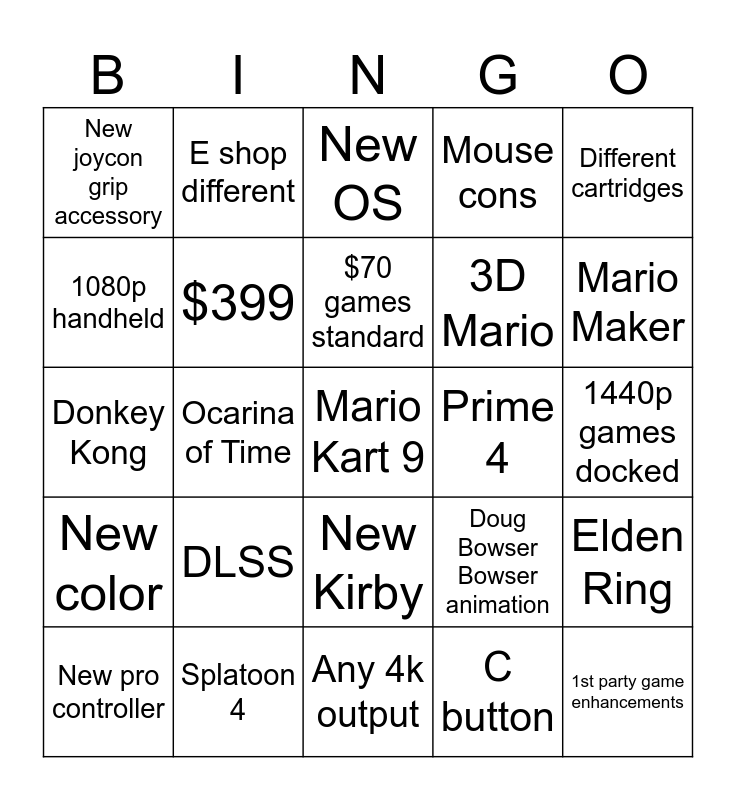 This bingo card has a free space and 24 words: DLSS, Splatoon 4, $70 games standard, New pro controller, Different cartridges, New joycon grip accessory, 1080p handheld, E shop different, Prime 4, New Kirby, 3D Mario, Donkey Kong, Doug Bowser Bowser animation, Elden Ring, $399, C button, 1440p games docked, New OS, Mario Maker, Ocarina of Time, 1st party game enhancements, New color, Mouse cons and Any 4k output.
