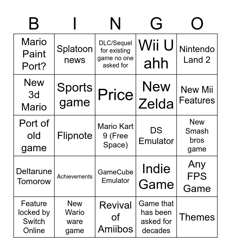 This bingo card has a free space and 24 words: Achievements, New Wario ware game, Price, Feature locked by Switch Online, Nintendo Land 2, Mario Paint Port?, New 3d Mario, Splatoon news, DS Emulator, GameCube Emulator, New Zelda, Port of old game, Indie Game, Any FPS Game, Sports game, Game that has been asked for decades, New Smash bros game, DLC/Sequel for existing game no one asked for, New Mii Features, Flipnote, Themes, Deltarune Tomorow, Wii U ahh and Revival of Amiibos.