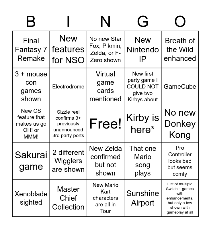 This bingo card has a free space and 24 words: 2 different Wigglers are shown, Master Chief Collection, Virtual game cards mentioned, Xenoblade sighted, Breath of the Wild enhanced, Final Fantasy 7 Remake, 3 + mouse con games shown, New features for NSO, Kirby is here*, New Zelda confirmed but not shown, New first party game I COULD NOT give two Kirbys about, New OS feature that makes us go OH! or MMM!, That one Mario song plays, Pro Controller looks bad but seems comfy, Electrodrome, Sunshine Airport, No new Donkey Kong, No new Star Fox, Pikmin, Zelda, or F-Zero shown, GameCube, Sizzle reel confirms 3+ previously unannounced 3rd party ports, List of multiple Switch 1 games with enhancements, but only a few shown with gameplay at all, Sakurai game, New Nintendo IP and New Mario Kart characters are all in Tour.