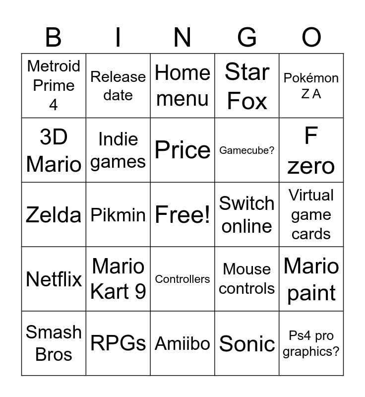 This bingo card has a free space and 24 words: Smash Bros, Mario Kart 9, Price, Sonic, Pokémon Z A, Metroid Prime 4, Release date, Home menu, Switch online, Virtual game cards, Zelda, Indie games, Mouse controls, Mario paint, 3D Mario, RPGs, Amiibo, Star Fox, F zero, Netflix, Pikmin, Controllers, Gamecube? and Ps4 pro graphics?.
