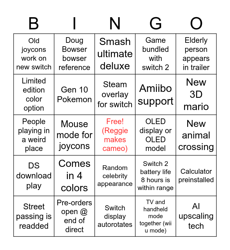 This bingo card has a free space and 29 words: Street passing is readded, C stands for chat, Mouse mode for joycons, Camera accessory, Old joycons work on new switch, Smash ultimate deluxe, Gen 10 Pokemon, Comes in 4 colors, OLED display or OLED model, Pre-orders open @ end of direct, New animal crossing, AI upscaling tech, Switch display autorotates, TV and handheld mode together (wii u mode), New 3D mario, Incorporates gen AI, Random celebrity appearance, DS download play, Elderly person appears in trailer, People playing in a weird place, Switch 2 battery life 8 hours is within range, Cartridge for Switch 2 game has a bump, Amiibo support, Limited edition color option, Game bundled with switch 2, Doug Bowser bowser reference, Calculator preinstalled, Steam overlay for switch and Stylus incorporated into console.