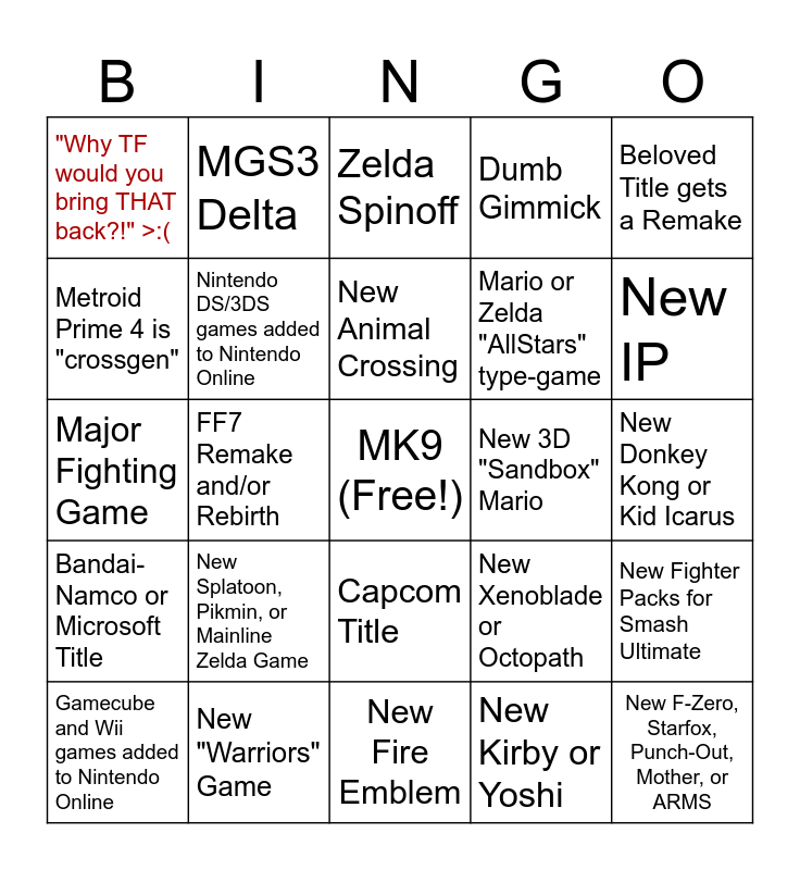 This bingo card has a free space and 24 words: New Splatoon, Pikmin, or Mainline Zelda Game, New "Warriors" Game, New Animal Crossing, Gamecube and Wii games added to Nintendo Online, Beloved Title gets a Remake, "Why TF would you bring THAT back?!" >:(, Metroid Prime 4 is "crossgen", MGS3 Delta, New 3D "Sandbox" Mario, Capcom Title, Mario or Zelda "AllStars" type-game, Major Fighting Game, New Xenoblade or Octopath, New Fighter Packs for Smash Ultimate, Nintendo DS/3DS games added to Nintendo Online, New Kirby or Yoshi, New Donkey Kong or Kid Icarus, Zelda Spinoff, New IP, FF7 Remake and/or Rebirth, New F-Zero, Starfox, Punch-Out, Mother, or ARMS, Bandai-Namco or Microsoft Title, Dumb Gimmick and New Fire Emblem.