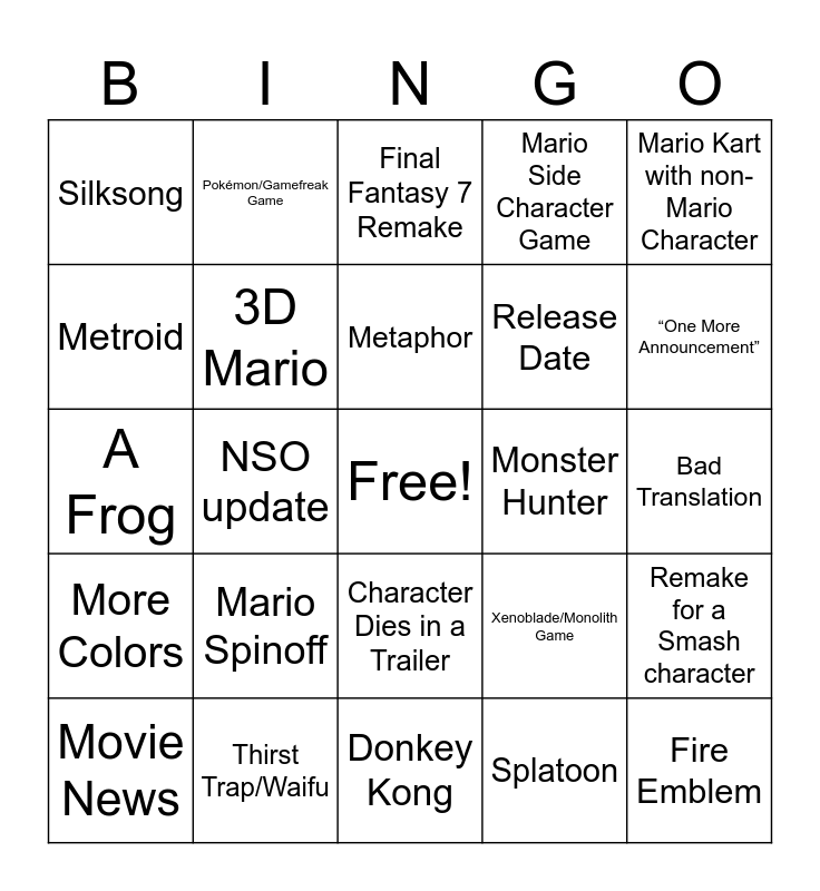 This bingo card has a free space and 49 words: Doug Bowser or Reggie, Fire Emblem, Sakurai, Donkey Kong, Mario Spinoff, Kirby, Pokémon/Gamefreak Game, Zelda, Metroid, Animal Crossing, 3D Mario, Mario Side Character Game, Remake for a Smash character, Xenoblade/Monolith Game, Studio Asano, Elden Ring, Metaphor, Monster Hunter, Smash, Mario Kart with non-Mario Character, NSO update, Splatoon, Silksong, Release Date, New First Party IP, “One More Announcement”, Movie News, Sonic, Character Dies in a Trailer, More Colors, R Rated Game, Anime Game, Roguelike, Starfox, Thirst Trap/Waifu, > 3 Farming Sims, Gacha, “It’s right behind me isn’t it?”, Bad Translation, Microtransaction, Amiibo, Rockstar Game, Sentient Food, Musical Instrument (No Ocarina), A Frog, Final Fantasy 7 Remake, Random Celebrity Cameo, ARMS 2 and Miyamoto.