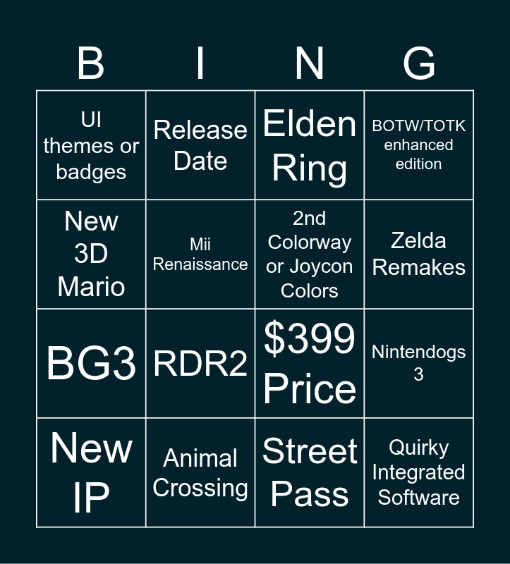 This bingo card has 16 words: Animal Crossing, Nintendogs 3, Elden Ring, UI themes or badges, BG3, Release Date, $399 Price, Street Pass, New 3D Mario, Mii Renaissance, New IP, BOTW/TOTK enhanced edition, RDR2, Zelda Remakes, 2nd Colorway or Joycon Colors and Quirky Integrated Software.