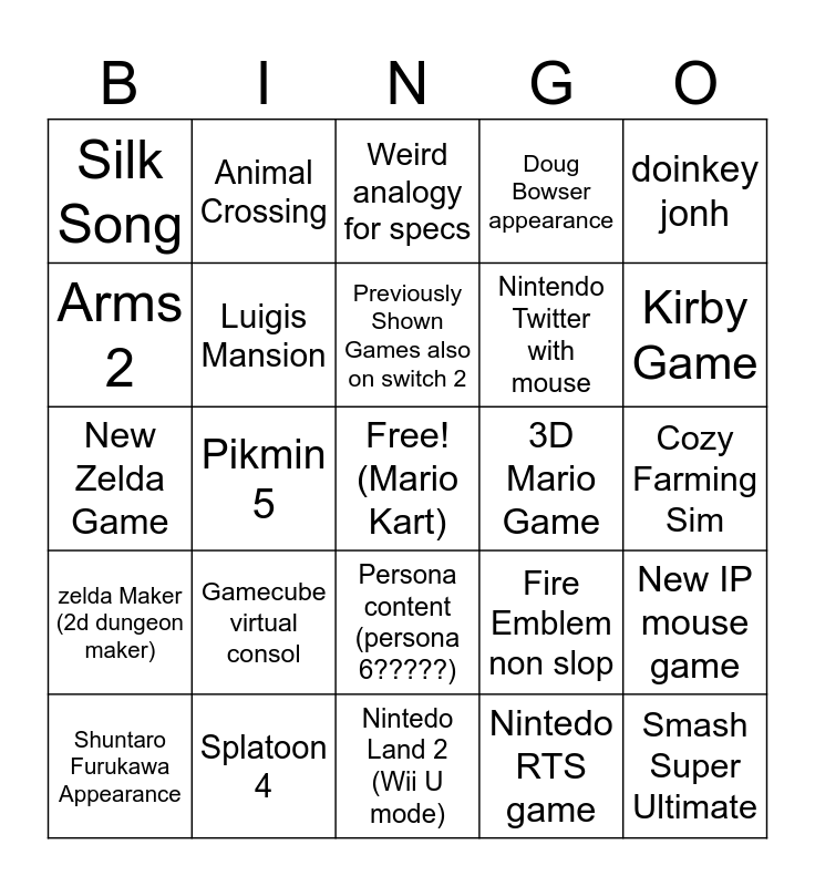 This bingo card has a free space and 24 words: Shuntaro Furukawa Appearance, Gamecube virtual consol, Previously Shown Games also on switch 2, Nintedo RTS game, doinkey jonh, Silk Song, Animal Crossing, Weird analogy for specs, 3D Mario Game, Cozy Farming Sim, New Zelda Game, Luigis Mansion, Fire Emblem non slop, New IP mouse game, Arms 2, Splatoon 4, Nintedo Land 2 (Wii U mode), Doug Bowser appearance, Kirby Game, zelda Maker (2d dungeon maker), Pikmin 5, Persona content (persona 6?????), Nintendo Twitter with mouse and Smash Super Ultimate.