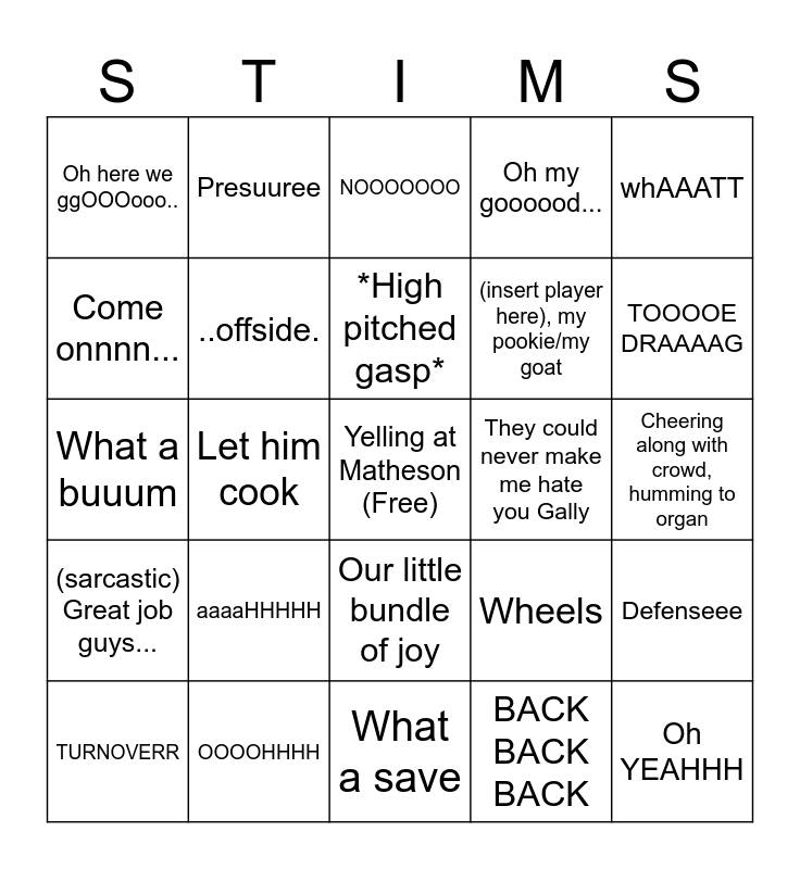 This bingo card has a free space and 24 words: aaaaHHHHH, OOOOHHHH, *High pitched gasp*, TURNOVERR, whAAATT, Oh here we ggOOOooo.., Come onnnn..., Presuuree, They could never make me hate you Gally, Our little bundle of joy, (insert player here), my pookie/my goat, What a buuum, Wheels, Defenseee, ..offside., BACK BACK BACK, Cheering along with crowd, humming to organ, NOOOOOOO, TOOOOE DRAAAAG, Let him cook, Oh YEAHHH, (sarcastic) Great job guys..., Oh my goooood... and What a save.