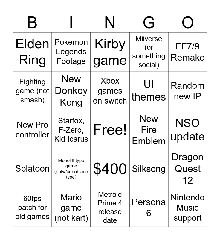 This bingo card has a free space and 24 words: Monolift type game (botw/xenoblade type), Mario game (not kart), Xbox games on switch, 60fps patch for old games, FF7/9 Remake, Elden Ring, Fighting game (not smash), Pokemon Legends Footage, New Fire Emblem, $400, UI themes, New Pro controller, Silksong, Dragon Quest 12, New Donkey Kong, Persona 6, NSO update, Kirby game, Random new IP, Starfox, F-Zero, Kid Icarus, Nintendo Music support, Splatoon, Miiverse (or something social) and Metroid Prime 4 release date.