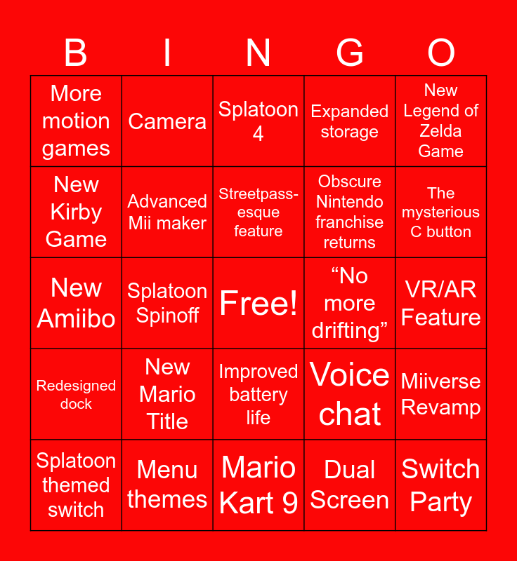 This bingo card has a free space and 24 words: New Mario Title, Menu themes, Streetpass-esque feature, Splatoon themed switch, New Legend of Zelda Game, More motion games, New Kirby Game, Camera, “No more drifting”, Improved battery life, Obscure Nintendo franchise returns, New Amiibo, Voice chat, Miiverse Revamp, Advanced Mii maker, Dual Screen, VR/AR Feature, Splatoon 4, The mysterious C button, Splatoon Spinoff, Switch Party, Redesigned dock, Expanded storage and Mario Kart 9.
