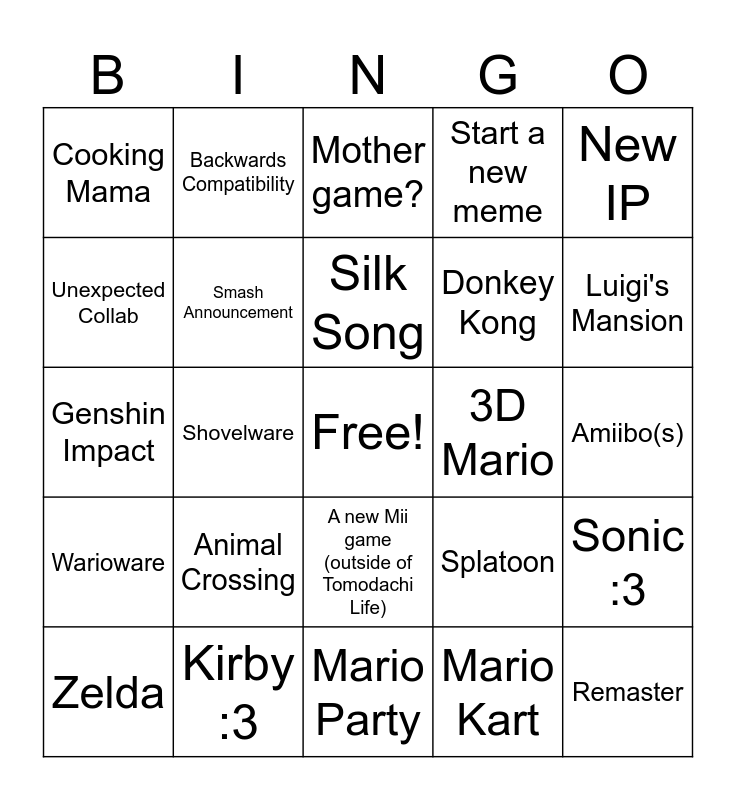 This bingo card has a free space and 24 words: Animal Crossing, Kirby :3, Silk Song, Zelda, New IP, Cooking Mama, Unexpected Collab, Backwards Compatibility, 3D Mario, A new Mii game (outside of Tomodachi Life), Donkey Kong, Genshin Impact, Splatoon, Sonic :3, Smash Announcement, Mario Kart, Amiibo(s), Mother game?, Luigi's Mansion, Shovelware, Remaster, Warioware, Start a new meme and Mario Party.