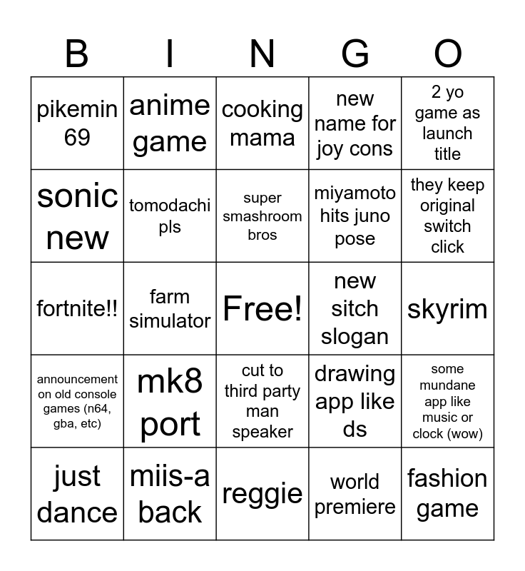 This bingo card has a free space and 24 words: mk8 port, miis-a back, super smashroom bros, just dance, 2 yo game as launch title, pikemin 69, sonic new, anime game, new sitch slogan, cut to third party man speaker, miyamoto hits juno pose, fortnite!!, drawing app like ds, some mundane app like music or clock (wow), tomodachi pls, world premiere, skyrim, cooking mama, they keep original switch click, farm simulator, fashion game, announcement on old console games (n64, gba, etc), new name for joy cons and reggie.