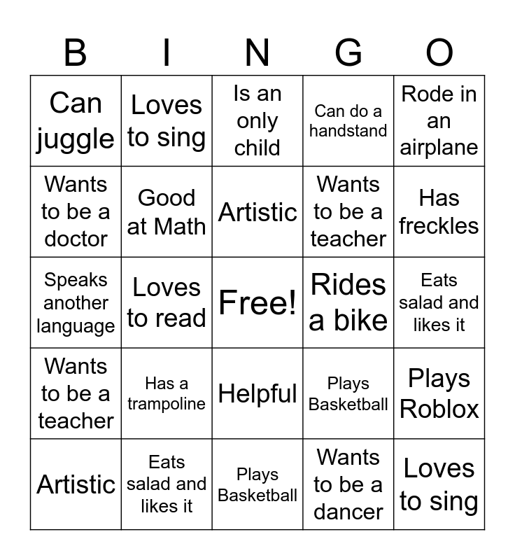 This bingo card has a free space and 53 words: Rides a bike, Loves to read, Has a Youtube Channel, Has a birthday this month, Has freckles, Has a pet, Loves to sing, Can juggle, Can do a handstand, Is an only child, Speaks another language, A good friend, Has a trampoline, Plays Roblox, 6 or more siblings, Eats salad and likes it, Artistic, Plays Basketball, Wants to be a Musician, Wants to be a doctor, Good at Math, Helpful, Wants to be a teacher, Rode in an airplane, Wants to be a dancer, Likes insects, Wants to be a Musician, Wants to be a doctor, Good at Math, Rides a bike, Loves to read, Has a Youtube Channel, Has a birthday this month, Has freckles, Has a pet, Loves to sing, Can juggle, Can do a handstand, Is an only child, Speaks another language, A good friend, Free!, Has a trampoline, Plays Roblox, 6 or more siblings, Eats salad and likes it, Artistic, Likes insects, Plays Basketball, Wants to be a dancer, Helpful, Wants to be a teacher and Rode in an airplane.