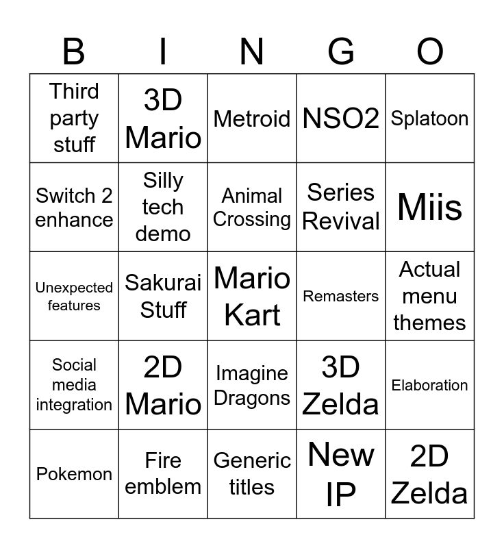 This bingo card has a free space and 24 words: 2D Mario, Fire emblem, Animal Crossing, Pokemon, Splatoon, Third party stuff, Switch 2 enhance, 3D Mario, Remasters, Imagine Dragons, Series Revival, Unexpected features, 3D Zelda, Elaboration, Silly tech demo, New IP, Actual menu themes, Metroid, Miis, Sakurai Stuff, 2D Zelda, Social media integration, NSO2 and Generic titles.
