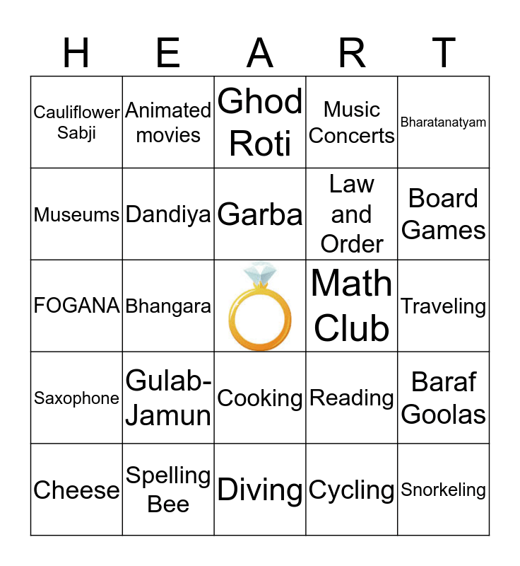 This bingo card has a free space and 29 words: Cheese, Basketball, Bhangara, Boogie-Boarding, Cauliflower Sabji, Ghod Roti, Dandiya, Gulab-Jamun, Math Club, Spelling Bee, Traveling, Snorkeling, Diving, Cycling, Board Games, Rajma-Rice, Cooking, Saxophone, Bharatanatyam, FOGANA, Reading, DDLJ, Law and Order, Museums, Music Concerts, Animated movies, Baraf Goolas, Garba and Beach..
