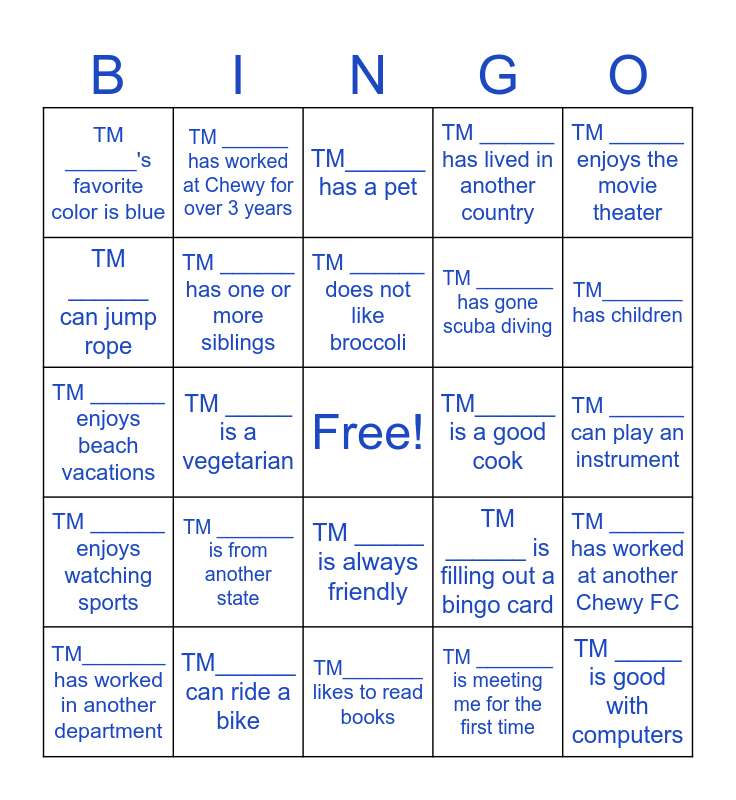 This bingo card has a free space and 24 words: TM_______ has worked in another department, TM _______ is from another state, TM ______ does not like broccoli, TM _______ is meeting me for the first time, TM ______ enjoys the movie theater, TM ______'s favorite color is blue, TM ______ has worked at Chewy for over 3 years, TM______ has a pet, TM______ is a good cook, TM ______ can play an instrument, TM ______ enjoys beach vacations, TM ______ has one or more siblings, TM ______ is filling out a bingo card, TM ______ has worked at another Chewy FC, TM ______ can jump rope, TM______ can ride a bike, TM_______ likes to read books, TM ______ has lived in another country, TM_______ has children, TM ______ enjoys watching sports, TM _____ is a vegetarian, TM _____ is always friendly, TM _______ has gone scuba diving and TM _____ is good with computers.