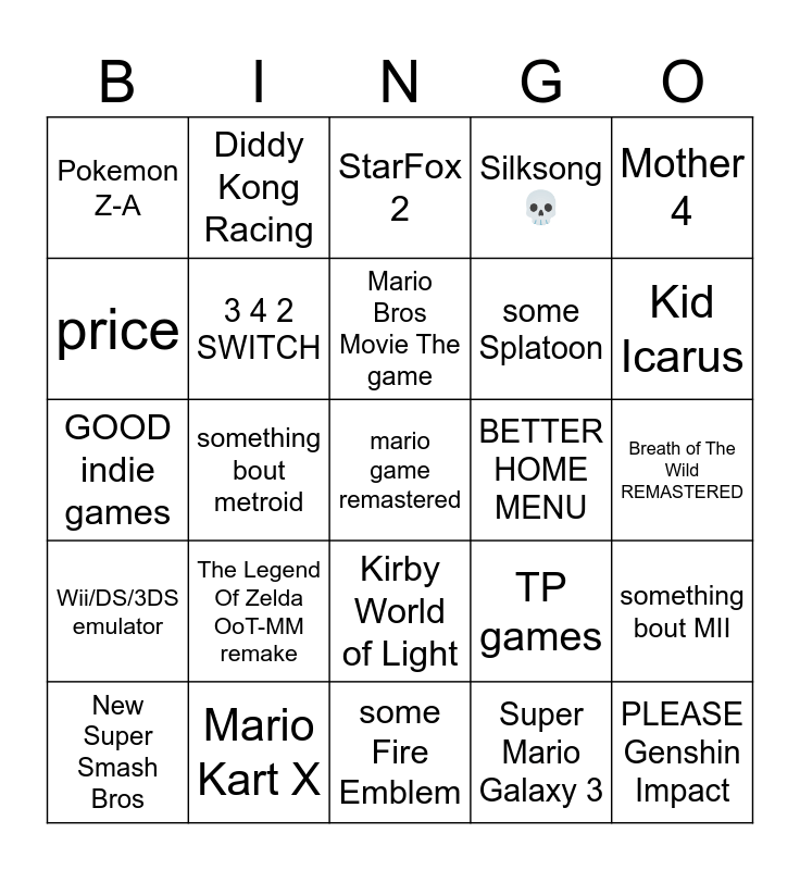 This bingo card has a free space and 24 words: The Legend Of Zelda OoT-MM remake, Mario Kart X, Mario Bros Movie The game, New Super Smash Bros, Mother 4, Pokemon Z-A, price, Diddy Kong Racing, BETTER HOME MENU, Kirby World of Light, some Splatoon, GOOD indie games, TP games, something bout MII, 3 4 2 SWITCH, Super Mario Galaxy 3, Breath of The Wild REMASTERED, StarFox 2, Kid Icarus, something bout metroid, PLEASE Genshin Impact, Wii/DS/3DS emulator, Silksong 💀 and some Fire Emblem.