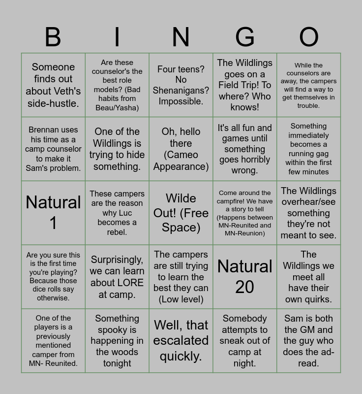 This bingo card has a free space and 24 words: Surprisingly, we can learn about LORE at camp., Something spooky is happening in the woods tonight, Oh, hello there (Cameo Appearance), One of the players is a previously mentioned camper from MN- Reunited., While the counselors are away, the campers will find a way to get themselves in trouble., Someone finds out about Veth's side-hustle., Brennan uses his time as a camp counselor to make it Sam's problem., Are these counselor's the best role models? (Bad habits from Beau/Yasha), Come around the campfire! We have a story to tell (Happens between MN-Reunited and MN-Reunion), The campers are still trying to learn the best they can (Low level), It's all fun and games until something goes horribly wrong., Natural 1, Natural 20, The Wildlings we meet all have their own quirks., One of the Wildlings is trying to hide something., Somebody attempts to sneak out of camp at night., The Wildlings overhear/see something they're not meant to see., Four teens? No Shenanigans? Impossible., Something immediately becomes a running gag within the first few minutes, These campers are the reason why Luc becomes a rebel., Sam is both the GM and the guy who does the ad-read., Are you sure this is the first time you're playing? Because those dice rolls say otherwise., The Wildlings goes on a Field Trip! To where? Who knows! and Well, that escalated quickly..