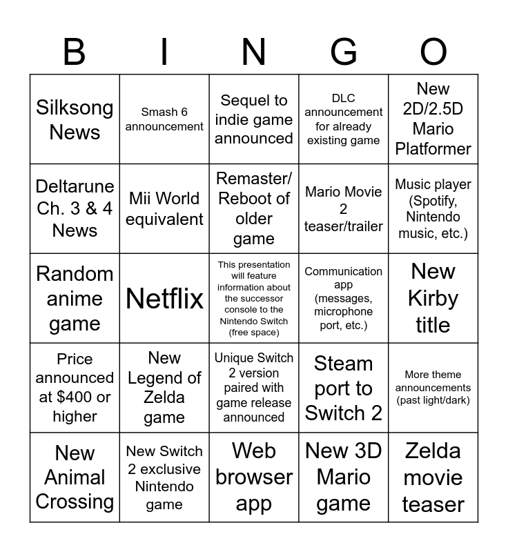 This bingo card has a free space and 24 words: New Legend of Zelda game, New Switch 2 exclusive Nintendo game, Remaster/ Reboot of older game, New Animal Crossing, New 2D/2.5D Mario Platformer, Silksong News, Deltarune Ch. 3 & 4 News, Smash 6 announcement, Communication app (messages, microphone port, etc.), Unique Switch 2 version paired with game release announced, Mario Movie 2 teaser/trailer, Random anime game, Steam port to Switch 2, More theme announcements (past light/dark), Mii World equivalent, New 3D Mario game, New Kirby title, Sequel to indie game announced, Music player (Spotify, Nintendo music, etc.), Netflix, Zelda movie teaser, Price announced at $400 or higher, DLC announcement for already existing game and Web browser app.
