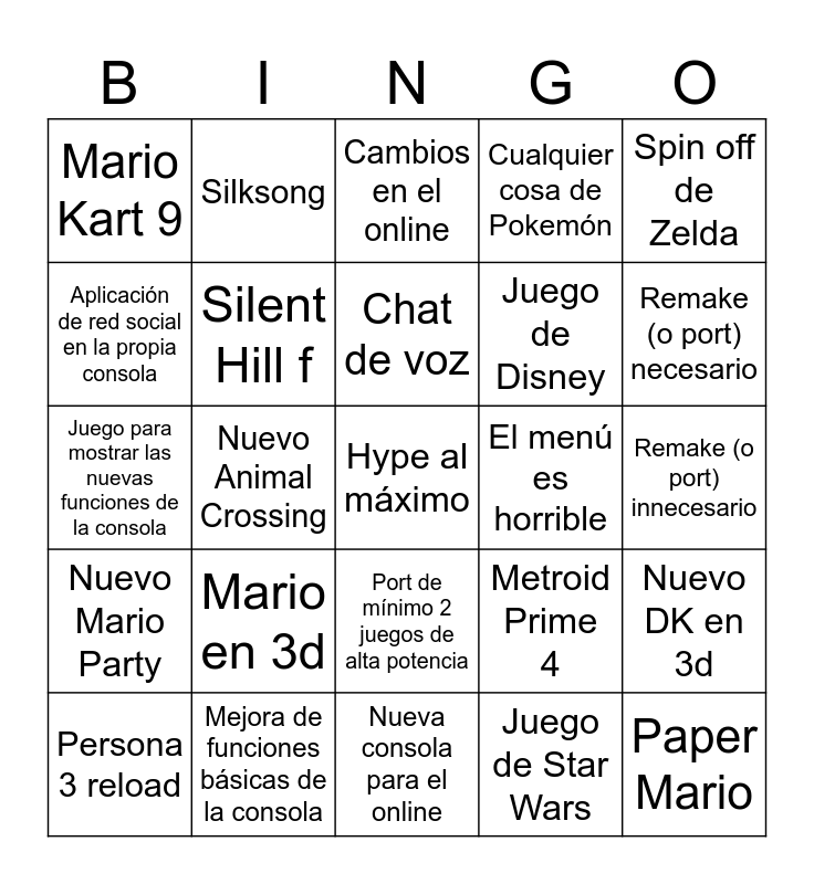 This bingo card has a free space and 24 words: Mario en 3d, Mejora de funciones básicas de la consola, Chat de voz, Persona 3 reload, Spin off de Zelda, Mario Kart 9, Aplicación de red social en la propia consola, Silksong, El menú es horrible, Port de mínimo 2 juegos de alta potencia, Juego de Disney, Juego para mostrar las nuevas funciones de la consola, Metroid Prime 4, Nuevo DK en 3d, Silent Hill f, Juego de Star Wars, Remake (o port) innecesario, Cambios en el online, Remake (o port) necesario, Nuevo Animal Crossing, Paper Mario, Nuevo Mario Party, Cualquier cosa de Pokemón and Nueva consola para el online.