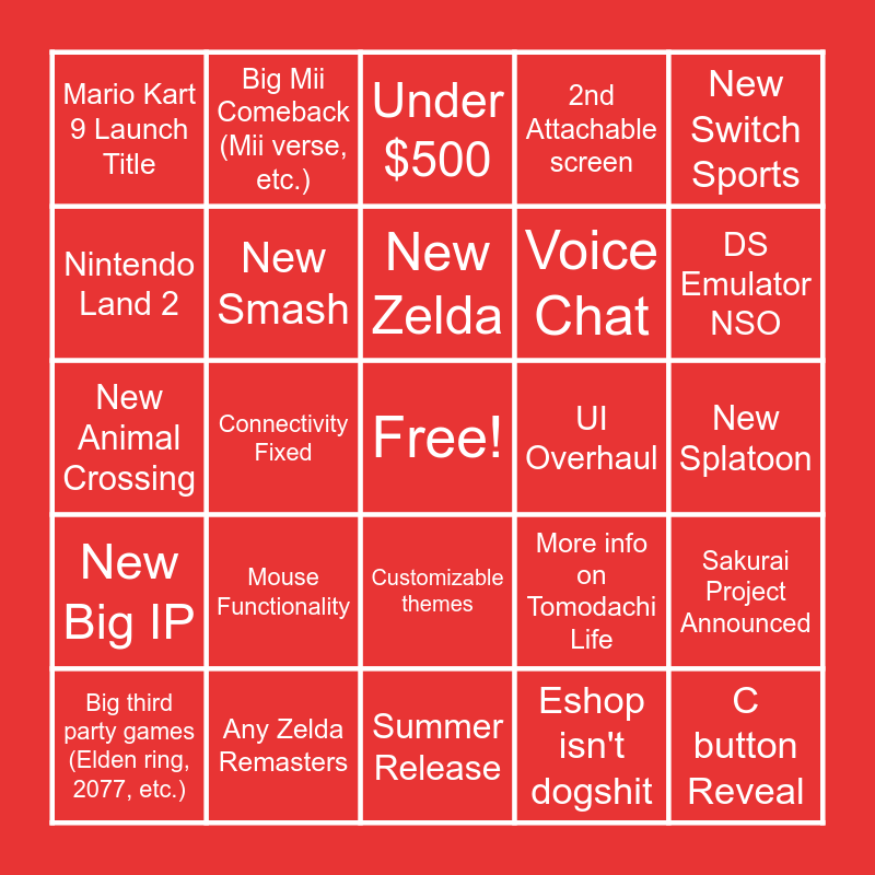 This bingo card has a free space and 24 words: Mouse Functionality, Any Zelda Remasters, New Zelda, Big third party games (Elden ring, 2077, etc.), New Switch Sports, Mario Kart 9 Launch Title, Nintendo Land 2, Big Mii Comeback (Mii verse, etc.), UI Overhaul, Customizable themes, Voice Chat, New Animal Crossing, More info on Tomodachi Life, Sakurai Project Announced, New Smash, Eshop isn't dogshit, New Splatoon, Under $500, DS Emulator NSO, Connectivity Fixed, C button Reveal, New Big IP, 2nd Attachable screen and Summer Release.