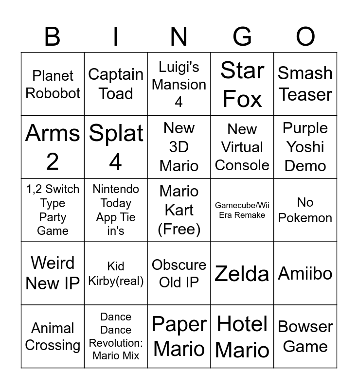 This bingo card has a free space and 24 words: Kid Kirby(real), Dance Dance Revolution: Mario Mix, New 3D Mario, Animal Crossing, Smash Teaser, Planet Robobot, Arms 2, Captain Toad, Gamecube/Wii Era Remake, Obscure Old IP, New Virtual Console, 1,2 Switch Type Party Game, Zelda, Amiibo, Splat 4, Hotel Mario, No Pokemon, Luigi's Mansion 4, Purple Yoshi Demo, Nintendo Today App Tie in's, Bowser Game, Weird New IP, Star Fox and Paper Mario.