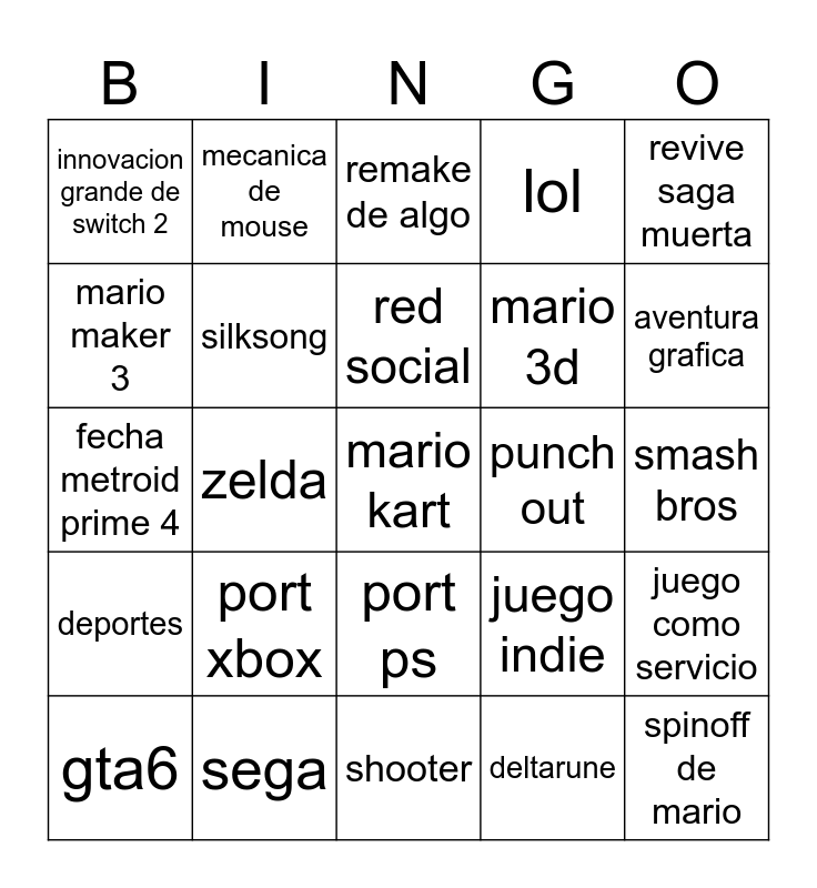 This bingo card has a free space and 24 words: port xbox, sega, red social, gta6, revive saga muerta, innovacion grande de switch 2, mario maker 3, mecanica de mouse, punch out, port ps, mario 3d, fecha metroid prime 4, juego indie, juego como servicio, silksong, deltarune, smash bros, remake de algo, aventura grafica, zelda, spinoff de mario, deportes, lol and shooter.
