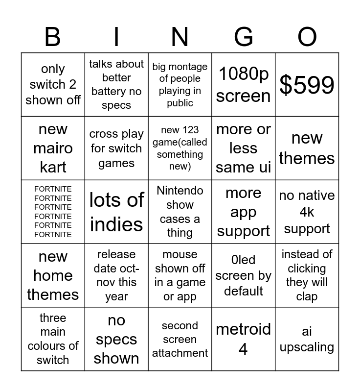 This bingo card has a free space and 24 words: release date oct-nov this year, no specs shown, new 123 game(called something new), three main colours of switch, $599, only switch 2 shown off, new mairo kart, talks about better battery no specs, more app support, mouse shown off in a game or app, more or less same ui, FORTNITE FORTNITE FORTNITE FORTNITE FORTNITE FORTNITE, 0led screen by default, instead of clicking they will clap, cross play for switch games, metroid 4, no native 4k support, big montage of people playing in public, new themes, lots of indies, ai upscaling, new home themes, 1080p screen and second screen attachment.