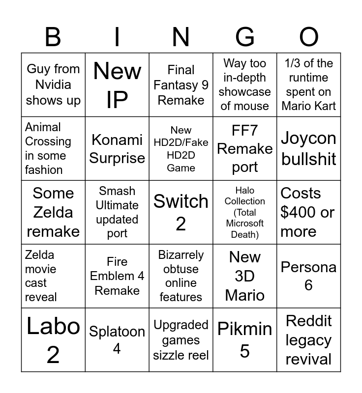 This bingo card has a free space and 24 words: Fire Emblem 4 Remake, Splatoon 4, New HD2D/Fake HD2D Game, Labo 2, 1/3 of the runtime spent on Mario Kart, Guy from Nvidia shows up, Animal Crossing in some fashion, New IP, Halo Collection (Total Microsoft Death), Bizarrely obtuse online features, FF7 Remake port, Some Zelda remake, New 3D Mario, Persona 6, Konami Surprise, Pikmin 5, Costs $400 or more, Final Fantasy 9 Remake, Joycon bullshit, Smash Ultimate updated port, Reddit legacy revival, Zelda movie cast reveal, Way too in-depth showcase of mouse and Upgraded games sizzle reel.