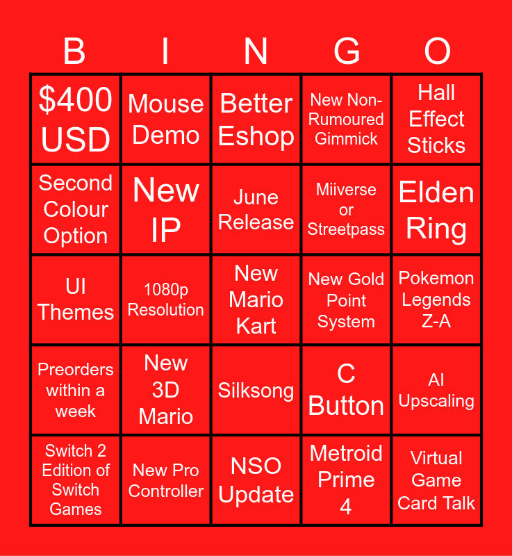 This bingo card has a free space and 24 words: New 3D Mario, New Pro Controller, June Release, Switch 2 Edition of Switch Games, Hall Effect Sticks, $400 USD, Second Colour Option, Mouse Demo, New Gold Point System, Silksong, Miiverse or Streetpass, UI Themes, C Button, AI Upscaling, New IP, Metroid Prime 4, Pokemon Legends Z-A, Better Eshop, Elden Ring, 1080p Resolution, Virtual Game Card Talk, Preorders within a week, New Non-Rumoured Gimmick and NSO Update.