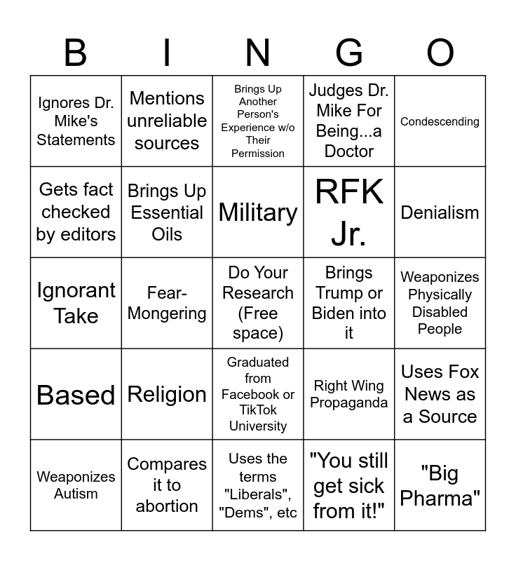 This bingo card has a free space and 24 words: Religion, Compares it to abortion, Military, Weaponizes Autism, Condescending, Ignores Dr. Mike's Statements, Gets fact checked by editors, Mentions unreliable sources, Brings Trump or Biden into it, Graduated from Facebook or TikTok University, RFK Jr., Ignorant Take, Right Wing Propaganda, Uses Fox News as a Source, Brings Up Essential Oils, "You still get sick from it!", Weaponizes Physically Disabled People, Brings Up Another Person's Experience w/o Their Permission, Denialism, Fear-Mongering, "Big Pharma", Based, Judges Dr. Mike For Being...a Doctor and Uses the terms "Liberals", "Dems", etc.