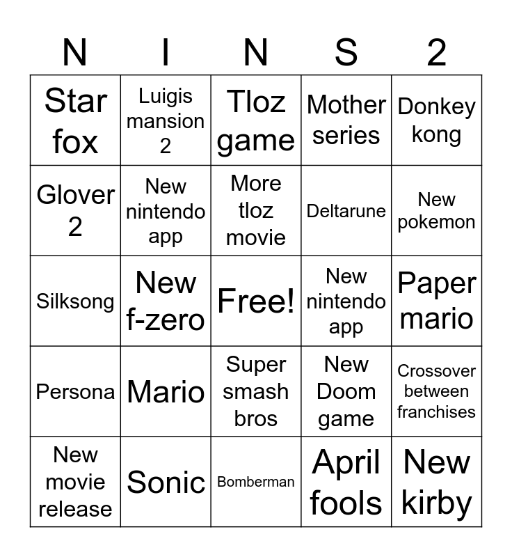 This bingo card has a free space and 24 words: Mario, Sonic, More tloz movie, New movie release, Donkey kong, Star fox, Glover 2, Luigis mansion 2, New nintendo app, Super smash bros, Deltarune, Silksong, New Doom game, Crossover between franchises, New nintendo app, April fools, Paper mario, Tloz game, New pokemon, New f-zero, New kirby, Persona, Mother series and Bomberman.