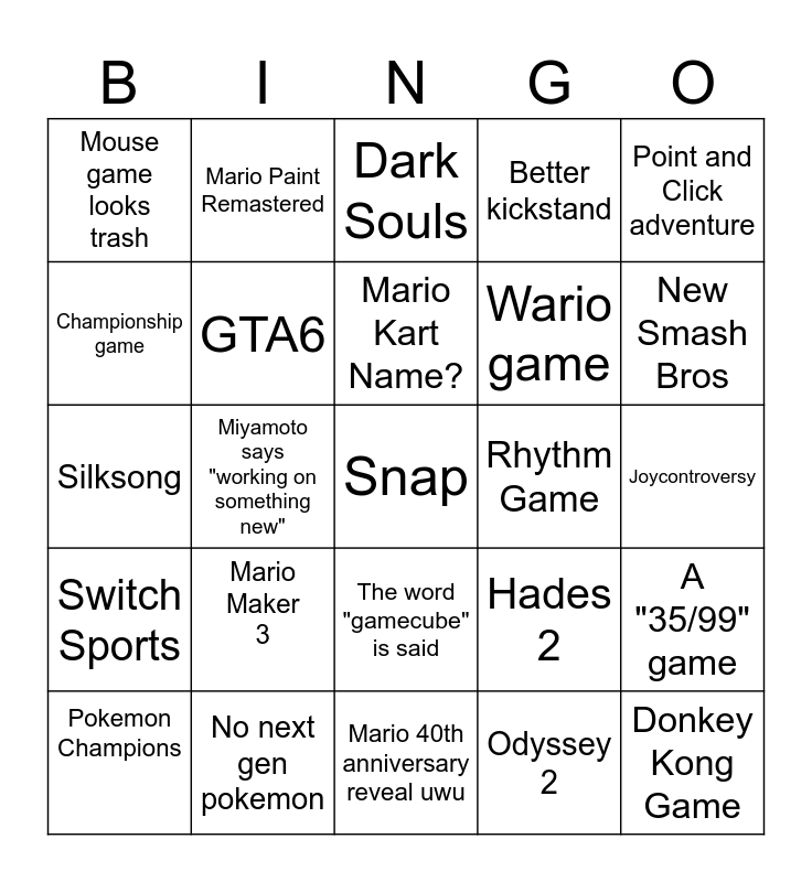 This bingo card has a free space and 24 words: Pokemon Champions, Mario Maker 3, Mario Kart Name?, Odyssey 2, Point and Click adventure, Mouse game looks trash, Mario Paint Remastered, Dark Souls, Rhythm Game, Joycontroversy, Silksong, GTA6, Hades 2, A "35/99" game, Championship game, No next gen pokemon, Mario 40th anniversary reveal uwu, Better kickstand, New Smash Bros, Switch Sports, Miyamoto says "working on something new", The word "gamecube" is said, Wario game and Donkey Kong Game.