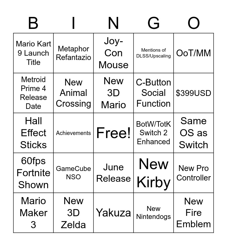 This bingo card has a free space and 24 words: GameCube NSO, New 3D Zelda, New 3D Mario, Mario Maker 3, OoT/MM, Mario Kart 9 Launch Title, Metroid Prime 4 Release Date, Metaphor Refantazio, BotW/TotK Switch 2 Enhanced, June Release, C-Button Social Function, Hall Effect Sticks, New Kirby, New Pro Controller, New Animal Crossing, New Nintendogs, Same OS as Switch, Joy-Con Mouse, $399USD, Achievements, New Fire Emblem, 60fps Fortnite Shown, Mentions of DLSS/Upscaling and Yakuza.