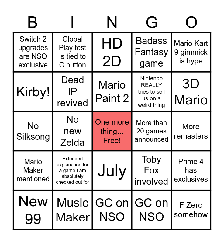 This bingo card has a free space and 25 words: Extended explanation for a game I am absolutely checked out for, GC on NSO, Mario Paint 2, New 99, Mario Kart 9 gimmick is hype, Switch 2 upgrades are NSO exclusive, Kirby!, Global Play test is tied to C button, More than 20 games announced, July, Nintendo REALLY tries to sell us on a weird thing, No Silksong, Toby Fox involved, Prime 4 has exclusives, Dead IP revived, Smash, More remasters, HD 2D, 3D Mario, No new Zelda, F Zero somehow, Music Maker, Mario Maker mentioned, Badass Fantasy game and GC on NSO.
