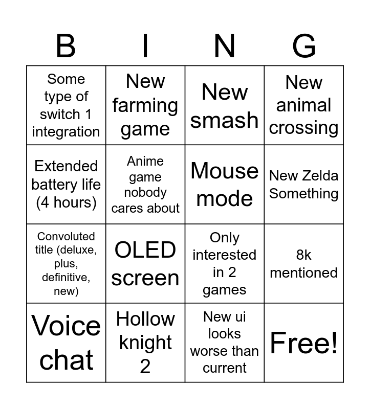 This bingo card has 23 words: Free!, New Mario Kart, New Zelda Something, Sakuri appearance, Extended battery life (4 hours), Some type of switch 1 integration, Anime game nobody cares about, New farming game, Voice chat, Pro controller not fc, OLED screen, Convoluted title (deluxe, plus, definitive, new), Switch sports resort, Boring 3rd party CEO, Hollow knight 2, Shovel knight, New smash, Only interested in 2 games, Mouse mode, 8k mentioned, New animal crossing, New ui looks worse than current and AI game.