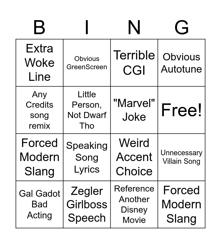 This bingo card has 17 words: Reference Another Disney Movie, Gal Gadot Bad Acting, Terrible CGI, Extra Woke Line, Speaking Song Lyrics, Obvious Autotune, Unnecessary Villain Song, "Marvel" Joke, Free!, Little Person, Not Dwarf Tho, Zegler Girlboss Speech, Weird Accent Choice, Any Credits song remix, Obvious GreenScreen, Forced Modern Slang, Random New Side Character and Forced Modern Slang.