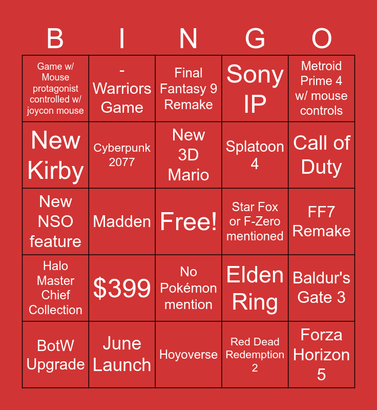 This bingo card has a free space and 24 words: $399, June Launch, New 3D Mario, BotW Upgrade, Metroid Prime 4 w/ mouse controls, Game w/ Mouse protagonist controlled w/ joycon mouse, New Kirby, - Warriors Game, Star Fox or F-Zero mentioned, No Pokémon mention, Splatoon 4, New NSO feature, Elden Ring, Baldur's Gate 3, Cyberpunk 2077, Red Dead Redemption 2, FF7 Remake, Final Fantasy 9 Remake, Call of Duty, Madden, Forza Horizon 5, Halo Master Chief Collection, Sony IP and Hoyoverse.